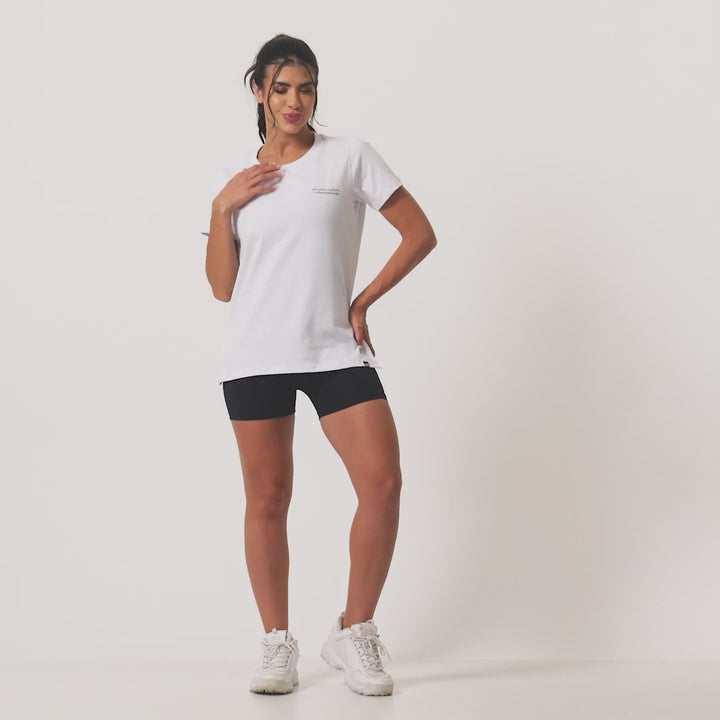 A gola ampla em ribana e o decote arredondado adicionam um toque de estilo e modernidade, enquanto o design minimalista em branco serve como tela perfeita para a frase estampada na frente, inspirando você a alcançar novos patamares em sua jornada fitness.