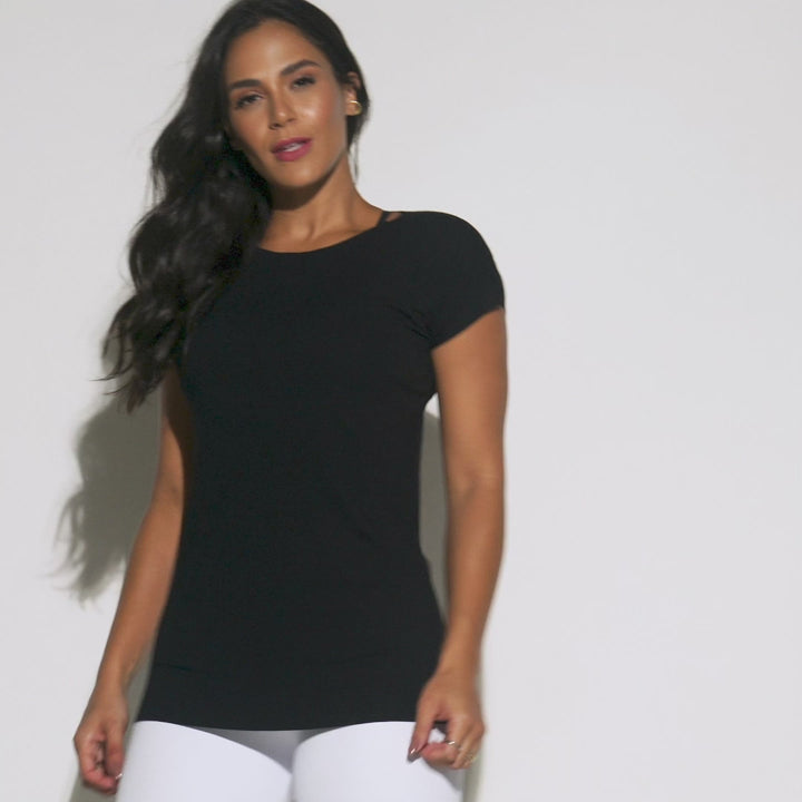 Com a barra alongada, essa blusa fitness funciona como tapa bumbum, dando mais segurança na hora de fazer exercícios de maior amplitude.