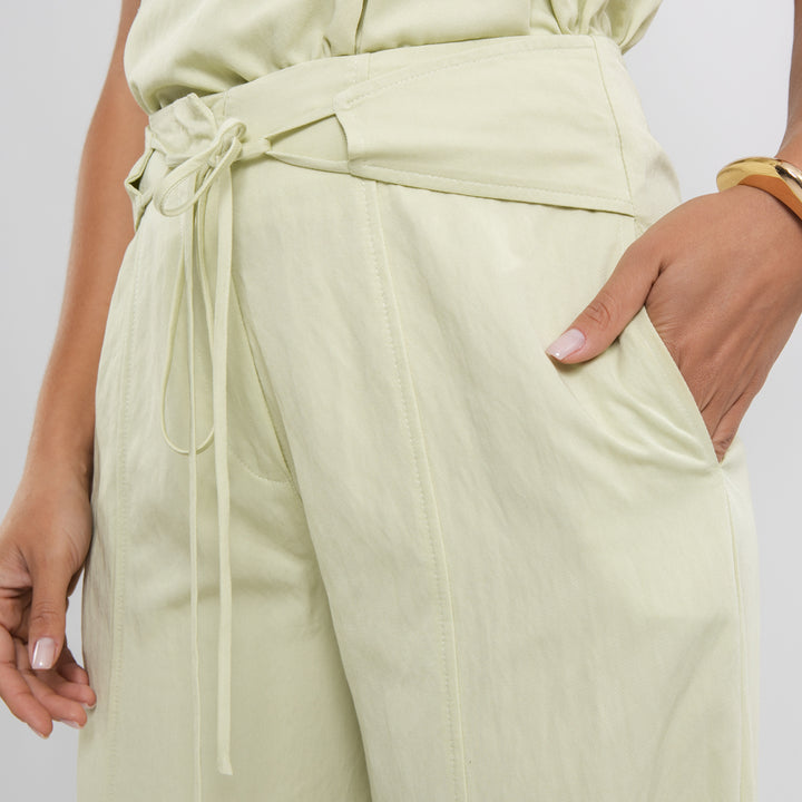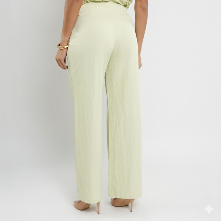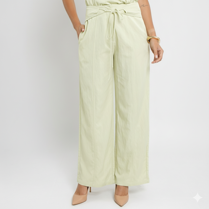 O detalhe de tiras frontais do próprio tecido adiciona um toque moderno e estiloso, tornando essa calça uma escolha versátil para produções elegantes e contemporâneas. A bainha larga na barra proporciona um caimento perfeito e ainda mais sofisticação, valorizando o look em cada movimento.