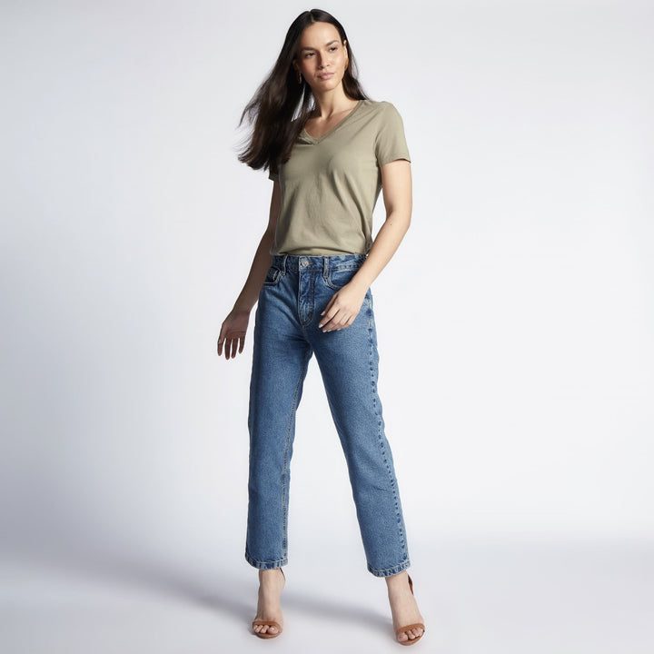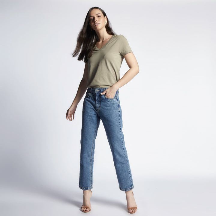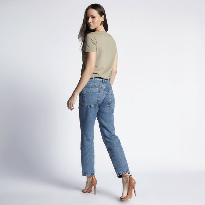 Com lavagem média, levemente estonada para um aspecto sofisticado, estas calças jeans oferecem uma aparência elegante e versátil. O corte Mom Jeans de cós médio proporciona conforto e estilo, enquanto o acabamento interno refinado com viés Confort no zíper garante um ajuste perfeito ao vestir. Feitas em tecido macio de jeans encorpado com algodão, oferecem conforto durante todo o dia. Possui a frase “Forte e corajosa” estampada na parte interna da cintura.