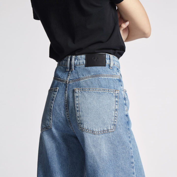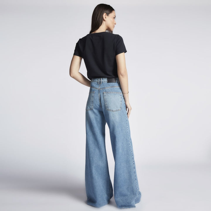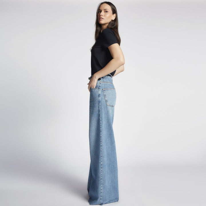 Apresentando uma lavagem média e um sutil Stone Wash, delicado e uniforme. Seu corte super wide, com uma boca de perna generosa, cerca de 37 cm, oferece um caimento impecável, enquanto a cintura alta adiciona um toque de sofisticação. Detalhes sofisticados, como o acabamento em couro preto em baixo relevo nas costas com o símbolo da marca, elevam ainda mais o seu estilo. Internamente, o acabamento em viés Confort no zíper garante um ajuste perfeito. Possui a frase “Forte e corajosa” estampada na parte interna da cintura. Confeccionada em tecido macio e encorpado de jeans em algodão, esta peça oferece qualidade e conforto excepcionais.