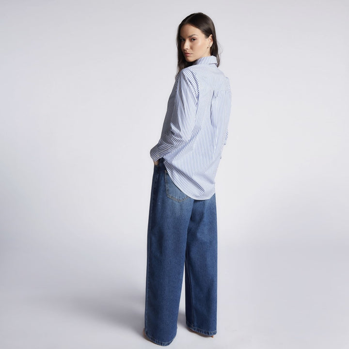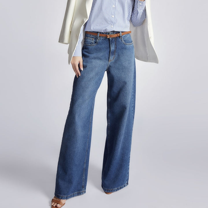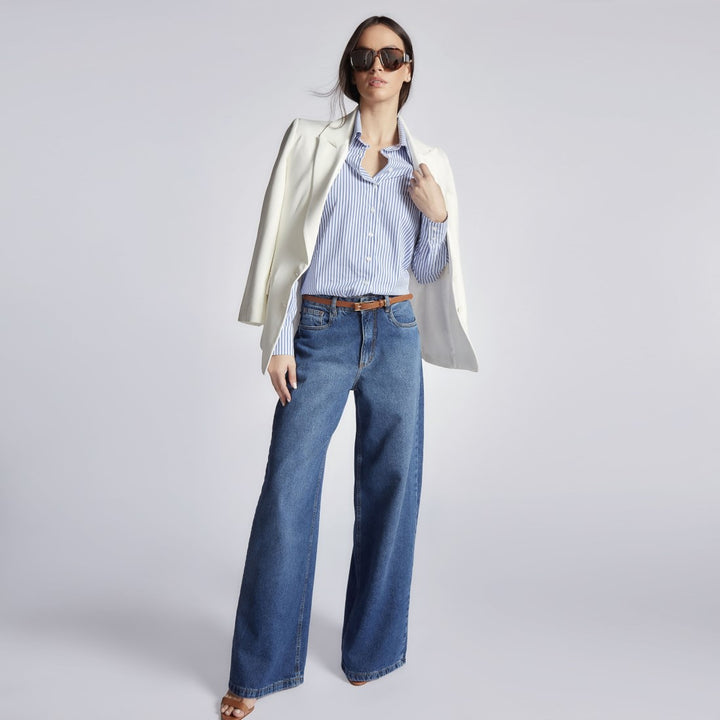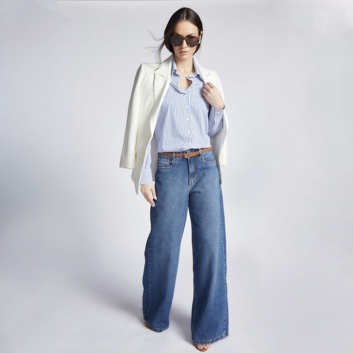 Com lavagem discreta em jeans escuro e corte super wide, cerca de 32 cm na abertura de cada perna, esta calça jeans feminina oferece um visual contemporâneo e confortável. A cintura média e o acabamento interno em viés no zíper proporcionam ajuste e conforto ideais. Feitas em tecido de algodão macio e encorpado, são perfeitas para mulheres que valorizam conforto e estilo em suas roupas. Possui a frase “Forte e corajosa” estampada na parte interna da cintura.