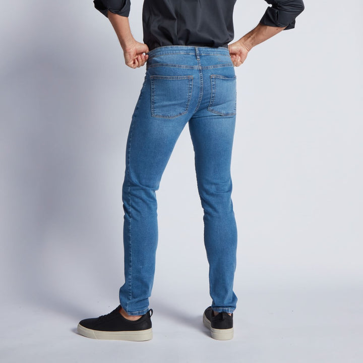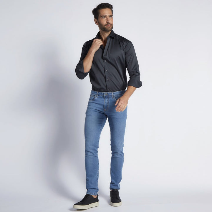 Calça Jeans Masculina Premium Skinny, modelagem de cintura média e corte anatômico nas costas. Feita em tecido de elastano, oferece leve elasticidade para liberdade de movimento e um toque macio e encorpado. Possui viés Comfort forrando o zíper, garantindo maior conforto ao vestir. Possui a frase “Vá cuidar da sua vida” estampada na parte interna da cintura.