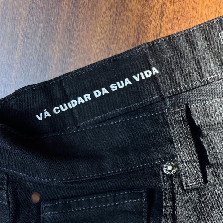 Calça Jeans Masculina Premium em corte Slim de caimento reto, possui cintura clássica, altura média. Jeans em lavagem escura, encorpado com elastano. Leve elasticidade que proporciona liberdade de movimento. Além de Viés Comfort forrando o zíper na parte interna, para maior conforto ao vestir. Possui a frase “Vá cuidar da sua vida” estampada na parte interna da cintura.