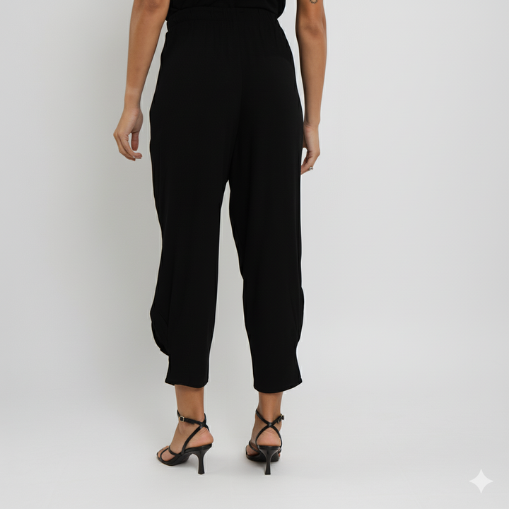 Com modelagem pantalona e pernas levemente afuniladas na barra, a calça cria um visual equilibrado e elegante, valorizando a silhueta com naturalidade. A cintura com elástico embutido garante ajuste perfeito ao corpo, enquanto os bolsos discretos e acabamento minimalista reforçam o ar refinado da peça.