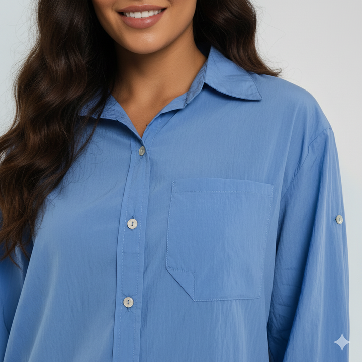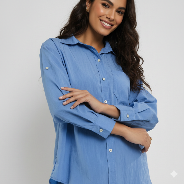 A modelagem da camisa é ampla e leve, com detalhes nas mangas que permitem duas formas de uso: dobradas e fixadas para um visual moderno e descontraído, ou soltas e desabotoadas para um estilo mais clássico. Nas costas, o recorte em V com tecidos sobrepostos adiciona um toque de ousadia e feminilidade, transformando uma camisa básica em uma peça fashion e cheia de personalidade.