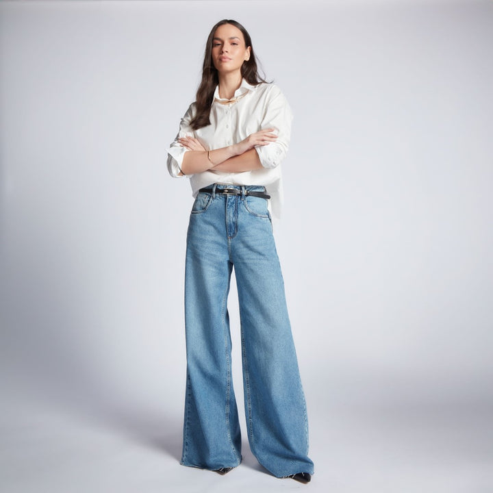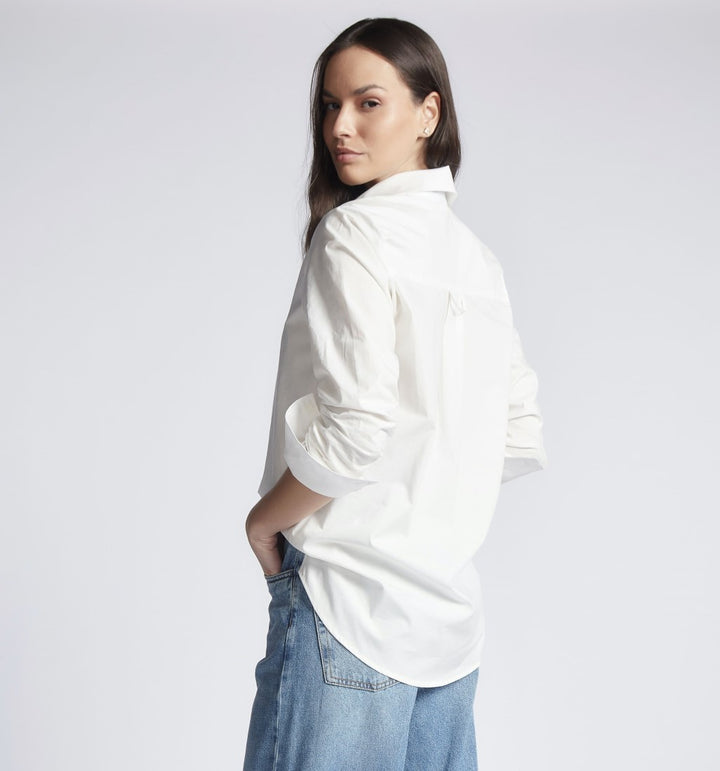 Com um design levemente oversized, esta camisa feminina apresenta detalhes que garantem sofisticação e estilo. Totalmente pespontada e com acabamentos internos de costura invisível, possui uma gola estruturada larga que adiciona elegância ao visual. Delicadas pregas nos punhos largos, com dois botões, e no centro das costas que proporcionam melhor ajuste e acabamento.