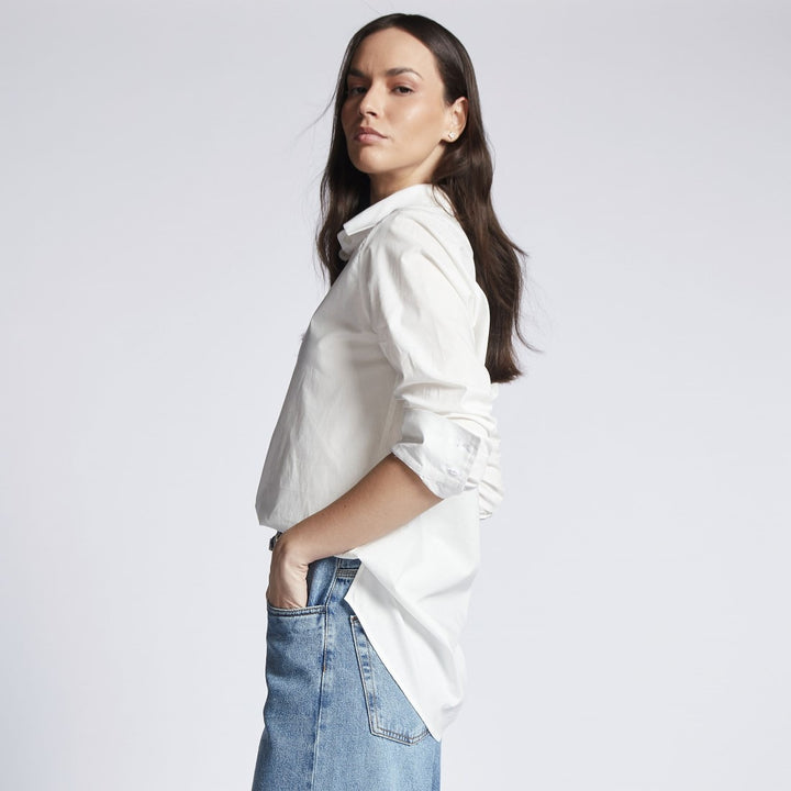 Lateral levemente fraldada para um caimento impecável. Fabricada em tecido de alto padrão em algodão com stretch, esta camisa oferece conforto e alta durabilidade, graças às suas fibras elásticas. Ideal para mulheres que buscam uma peça elegante e sofisticada.