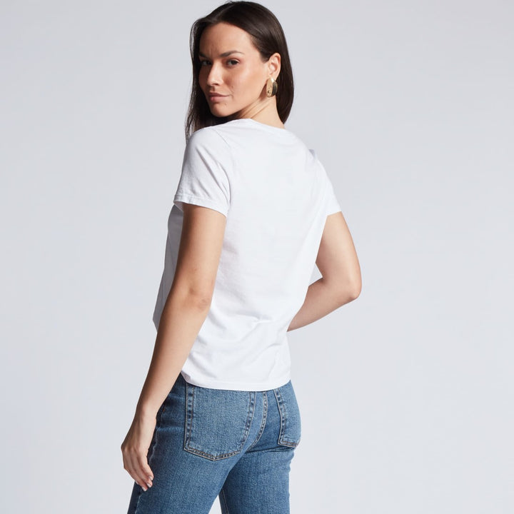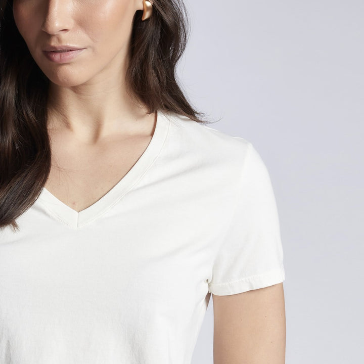 Apresentando um corte feminino levemente Slim, esta camiseta é uma escolha elegante e moderna. Sua gola em V com acabamento de pesponto tanto na gola quanto nos ombros adiciona um toque de sofisticação. Produzida em malha fio 30, 100% algodão, proporciona um toque macio e agradável, ideal para os dias mais quentes pois permite a troca de calor. O detalhe da logo na barra assina a peça de forma discreta e refinada.