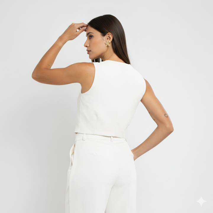 O Colete Feminino de Alfaiataria com Elastano – Tecido Estruturado é a peça que traduz elegância, modernidade e versatilidade em um único design. Inspirado na alfaiataria clássica masculina, ele ganha um toque delicado e contemporâneo através de recortes femininos e caimento impecável, tornando-se indispensável no guarda-roupa da mulher moderna.