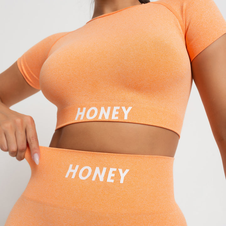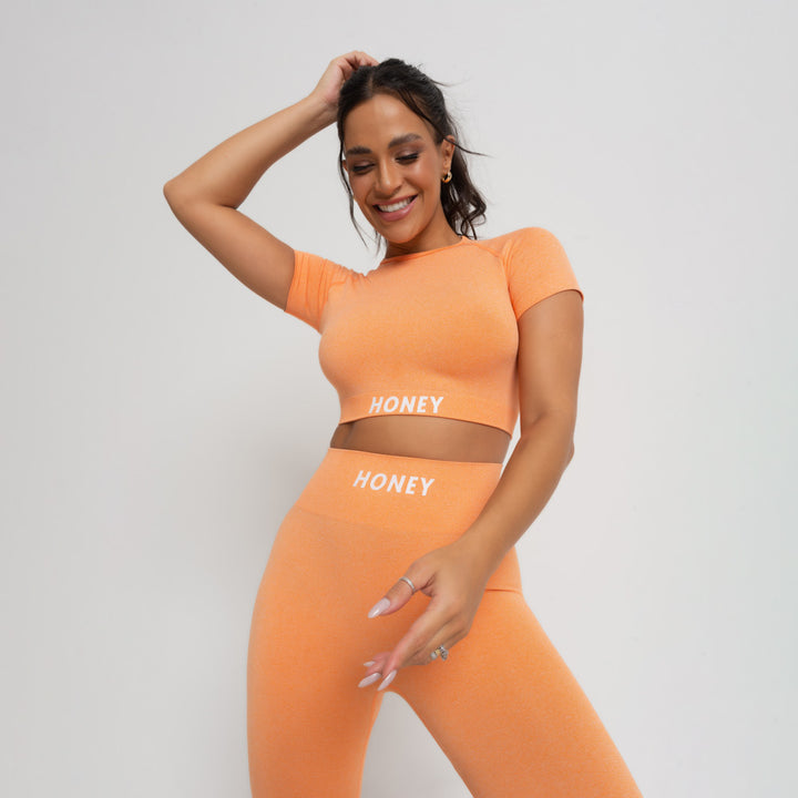 • O Conjunto Fitness Seamless Mesclado Laranja CO460 é um lançamento que faz parte da nova linha Honey Be, Honey Seamless ®!! Uma coleção que traz a tecnologia Sem Costura para os looks. Pensando especialmente nas nossas Honey Musas, que estão buscando conforto, tendência e estilo na hora do treino.