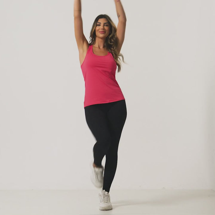 As costas ligeiramente alongadas conferem um ajuste confortável, oferecendo o estilo tapa-bumbum que dá mais segurança e conforto ao treino. As alças largas, com acabamento em viés, garantem firmeza e conforto, permitindo que você se mova com confiança em qualquer atividade.