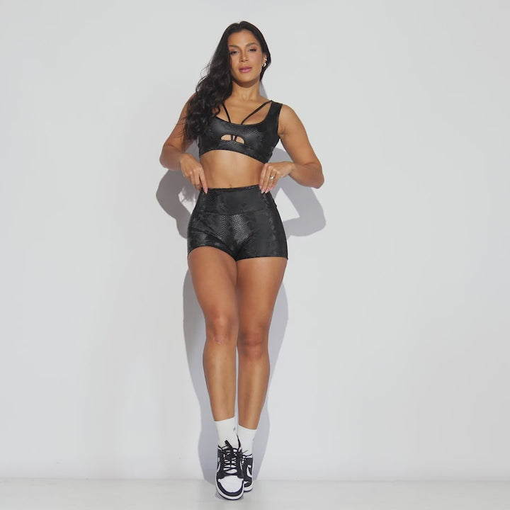 O Short Fitness Básico, um item indispensável para suas atividades físicas. Fabricado em tecido de alta qualidade, esse short possui um toque emborrachado e uma textura imitando cobra, garantindo estilo e conforto durante o uso. Sua modelagem com gancho pespontado e cós anatômico com elástico embutido se ajusta perfeitamente ao corpo, proporcionando um caimento impecável.