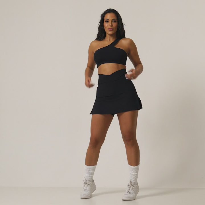 Este top apresenta um Decote Assimétrico com Alça Transversal, conferindo um toque elegante e contemporâneo ao design. Suas Alças Mais Largas, com acabamento em viés, garantem sustentação adicional, proporcionando confiança durante a prática esportiva.