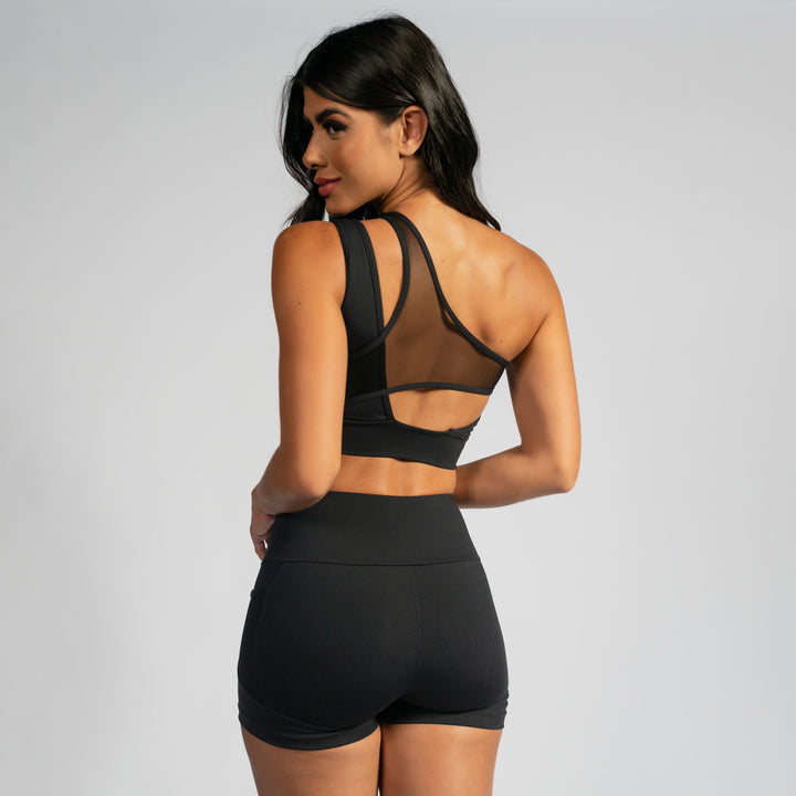 <strong>Top Fitness Preto Assimétrico Celebrity Tule </strong><br><br>