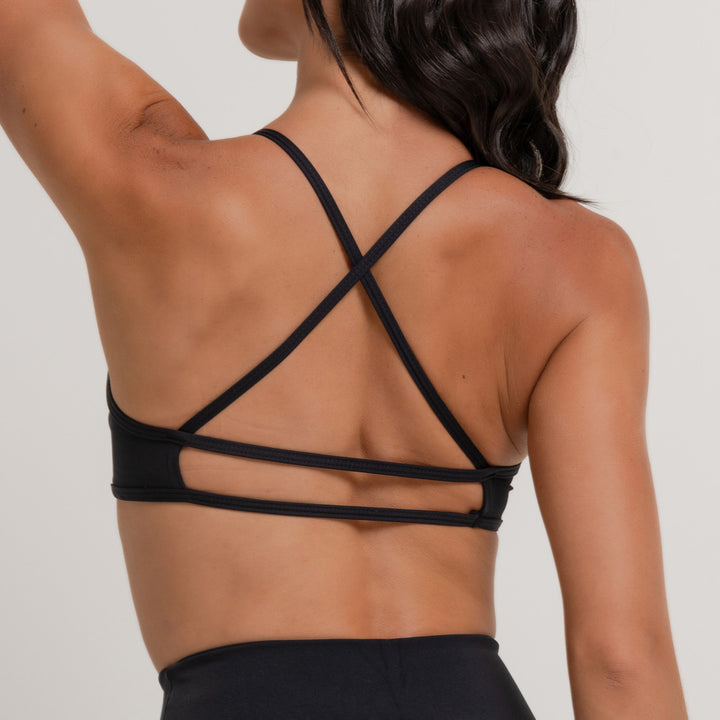 As alças cruzadas nas costas não só proporcionam suporte adicional, mas também conferem um visual moderno. O acabamento em viés destaca a qualidade e durabilidade do top, enquanto o tecido de média compressão abraça o corpo de maneira confortável, oferecendo suporte sem comprometer a liberdade de movimento.